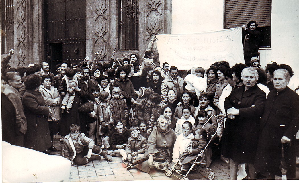Grupo de adjudicatarios de las primeras viviendas del barrio Guadalquivir, acampados en la puerta del Ayuntamiento tras ser expulsados por la policía del edificio consistorial donde se encerraron en solicitud de ayuda para resolver el conflicto. Más de mil familias esperaban para ocupar su vivienda desde junio de 1983. |